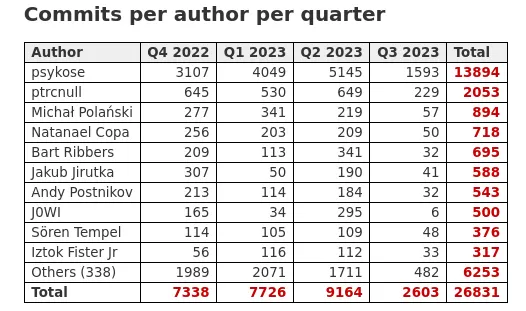 Alice “psykose” who is easily responsible for the highest number of commits per author over the past year has decided to step down from maintaining her packages.