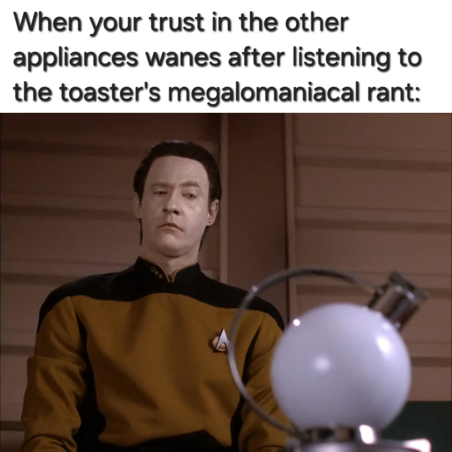 Toaster reference from Fallout: New Vegas - Old World Blues DLC or Add-on, as we used to call them. It was the style of the time. Now where was I? Right. I was wearin’ an onion on my belt…