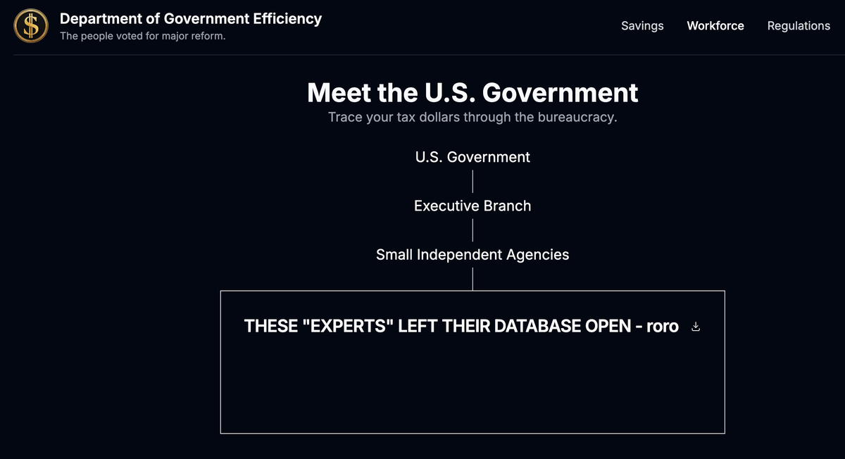 The doge[.]gov website that was spun up to track Elon Musk’s cuts to the federal government is insecure and pulls from a database that can be edited by anyone, according to two separate people who found the vulnerability and shared it with 404 Media. One coder added at least two database entries that are visible on the live site and say “this is a joke of a .gov site” and “THESE ‘EXPERTS’ LEFT THEIR DATABASE OPEN -roro.”
