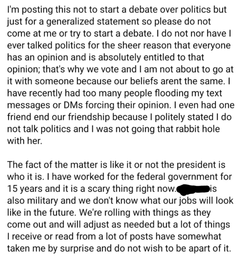 The fact of the matter is like it or not the president is who it is. I have worked for the federal government for 15 years and it is a scary thing right now. [Redacted] also military and we don’t know what our jobs will look like in the future. We’re rolling with things as they come out and will adjust as needed but a lot of things I receive or read from a lot of posts have somewhat taken me by surprise and do not wish to be apart of it.