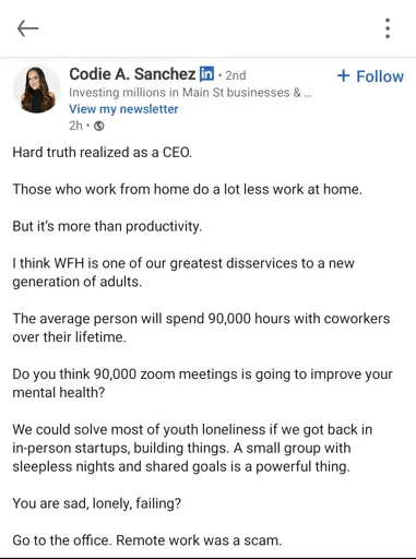 alphacyberranger@sh.itjust.works to LinkedinLunatics@sh.itjust.worksEnglish · 6 months agoYouth loneliness is cured by Adults going into the officesh.itjust.worksimagemessage-square106linkfedilinkarrow-up1542arrow-down118