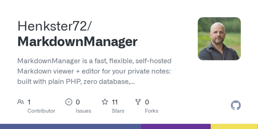 So I built MarkdownManager: a small self-hosted tool that lets you browse and edit a folder of .md notes in your browser, with a preview right next to it. The important part: your notes stay as normal files on disk. No database, no vendor-shaped gravity well. If you stop using it, nothing breaks and your files are still just… files.