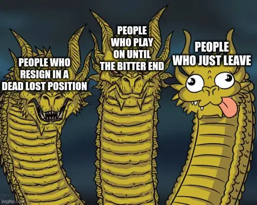 I’m not exactly clear on when to resign if I blunder away my queen. If it is part of my opening, I will resign, and if I’m in the end game, I won’t. But at what point does etiquette say you should? Do opponents want to play out an uneven match? I like to play out games for practice, even if I’m hopeless, but I don’t want my opponents to feel like they are wasting their time.