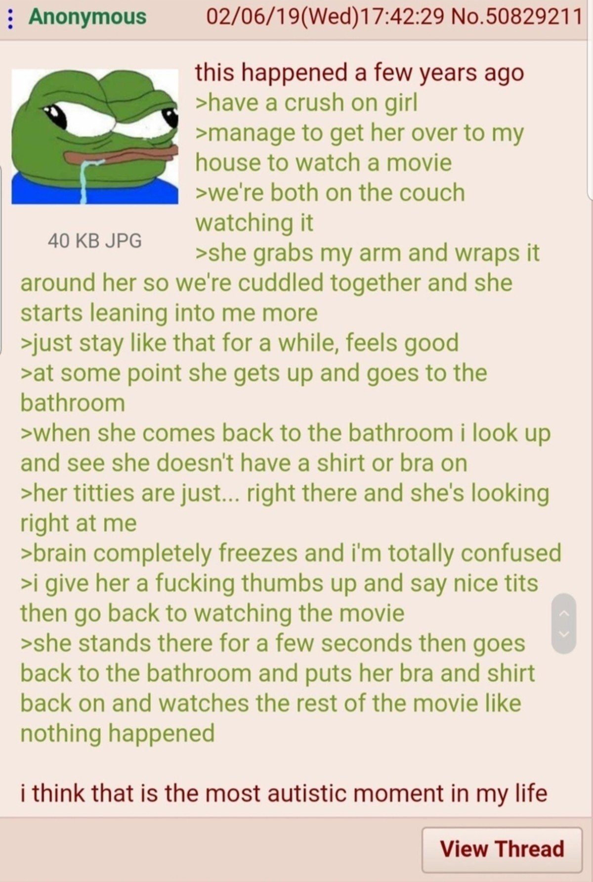 Probably not that weird when you go to someones house to “watch a movie” and end up actually watching a movie. And then the dude doesnt even get the hint when she basically rubs up against him. At that point she probably said fuck it, ill get naked and if that doesnt work i dont know either. And it didnt work